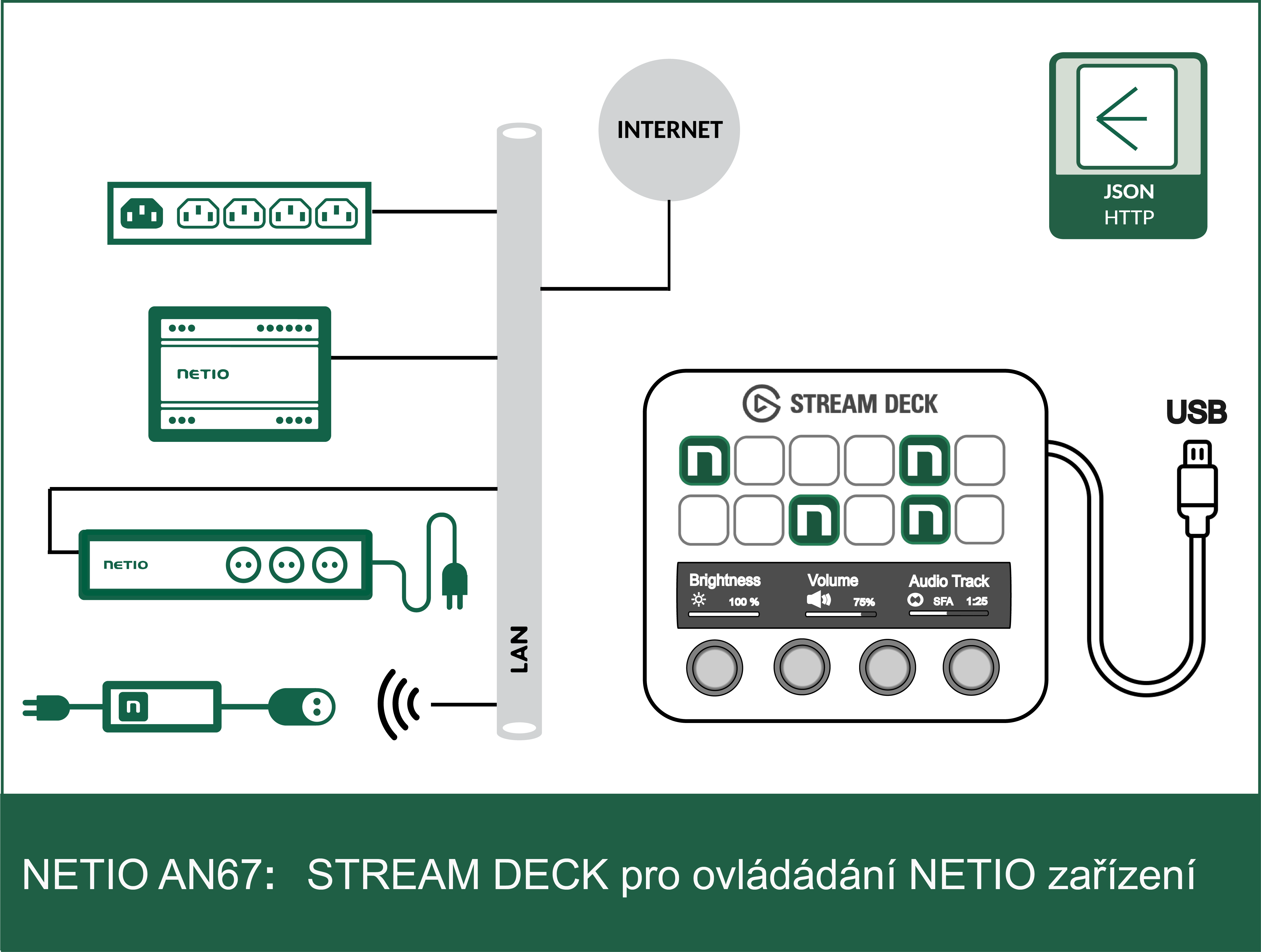AN68 demonstruje, jak ovládat výstup(y) napájení na jednotkách NETIO PDU z ELGATO Stream Deck. Používá bezplatný plugin od společnosti VIVRE MOTION.