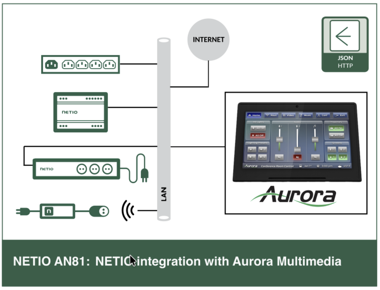 The AN81 demonstrates how to control NETIO device via Aurora Multimedia enviroment by using ReAX system and JSON API.