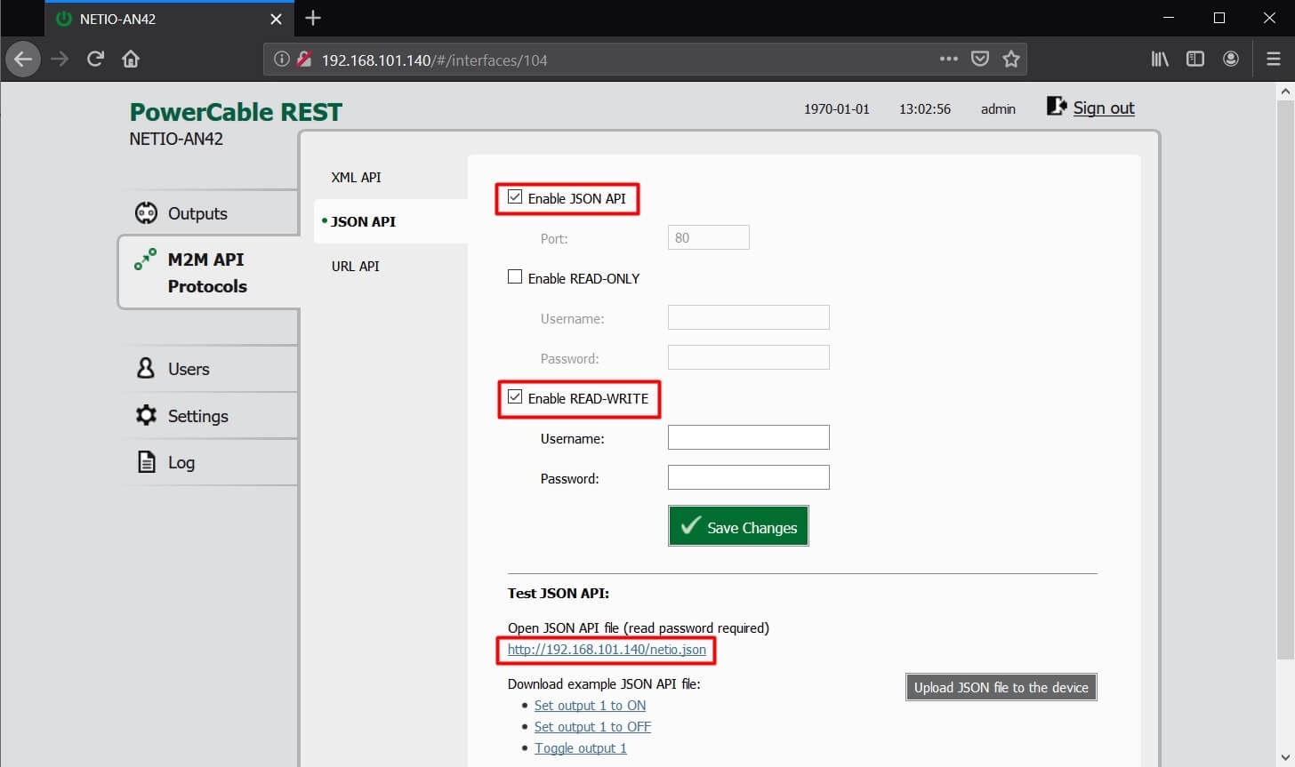 Ve webovém rozhraní zařízení v sekci M2M API Protocols - JSON API, je třeba povolit JSON API.
