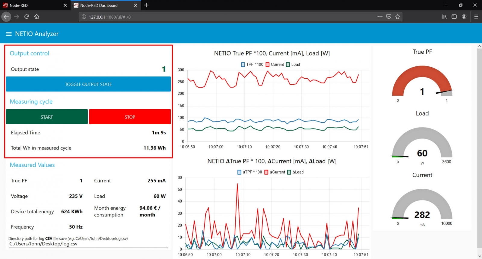 Tlačítko START započne měřený cyklus a stahovaní dat pomocí http request bloku (HTTP GET) z vašeho NETIO chytrého zařízení v sekundových intervalech a začne vypisovat a zobrazovat data v Dashboardu. Pokud je správně vyplněná cesta a jméno log souboru, tak navíc zapisuje měřená data každou vteřinu do log souboru.