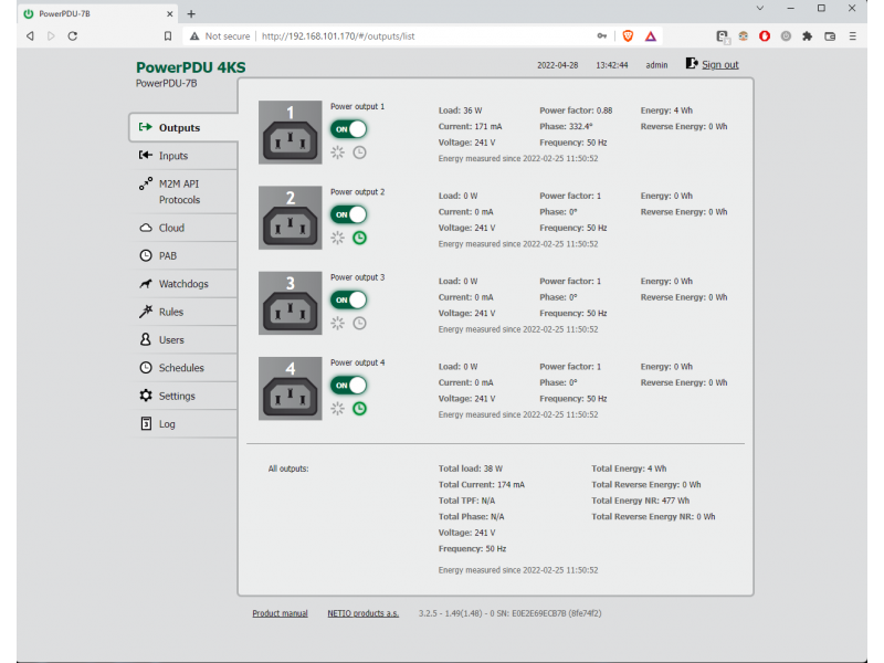 NETIO PowerPDU 4KS measures electrical parameters on 4 outputs + 1 total channel:
